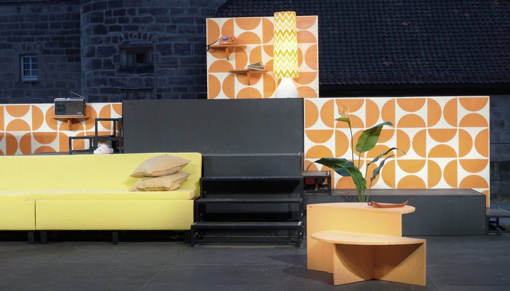Das kurzweilige Stück spielt im Wohnzimmer der Liebigs, eine lange Couchlandschaft und 70er Jahre Tapetenmuster bilden den Rahmen. Überall befinden sich versteckte Abgänge – ins Bad, ins Schlafzimmer, in die Küche, und so wird das Labyrinth aus Notlügen, dass sich im Stück entspinnt, auch zum Hindernislauf für Heinrich und seine Gäste.