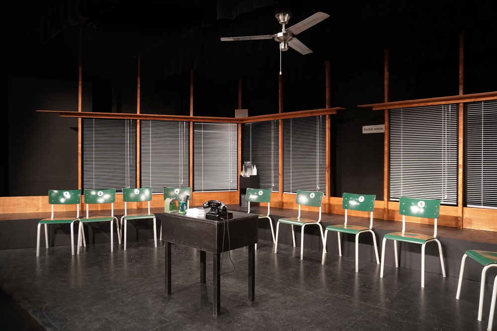 Das Bühnenbild zeigt einen abgedunkelten Raum, die Hitze der Straße dringt kaum herrein, die Jalousien sind herrabgezogen. Links liegt ein karges Bad, rechts ein weiteres Fenster. Eine lange Bank begrenzt, wie ein enger Rahmen, den gesamten Spielbereich. Die Geschworenen sitzen dicht aufeinander. Filigrane Reihen von Fenstern, die an die frühen Stahl-Konstruktionen der Wolkenkratzer von Manhatten erinnern, umschließen den Raum. Zugleich erinnern sie an die Gitter in Gefängnissen. Doch die Bühne hinter den Fenstern ist schwarz, wodurch der Raum im Gerichtssahl einsam und von der Zeit losgelöst erscheint. Diese leere Offenheit und gleichzeitige Begrenzung des Raums, erzeugt eine intensive Atmosphäre, eine nach Innen gerichtete Konzentration allein auf das hier und jetzt.